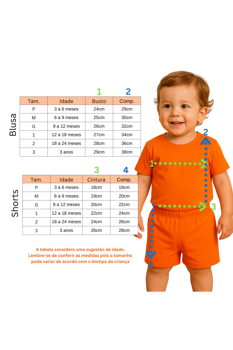 A tabela poderá sofrer alterações de 1 á 2 cm para mais ou menos por conta da modelagem e costura, leve isso em conta na hora de selecionar o tamanho adequado.